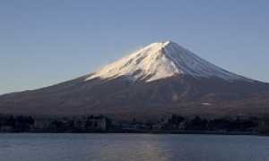 Drawing of a Pagoda near Mt Fuji, by a cherry blossom tree